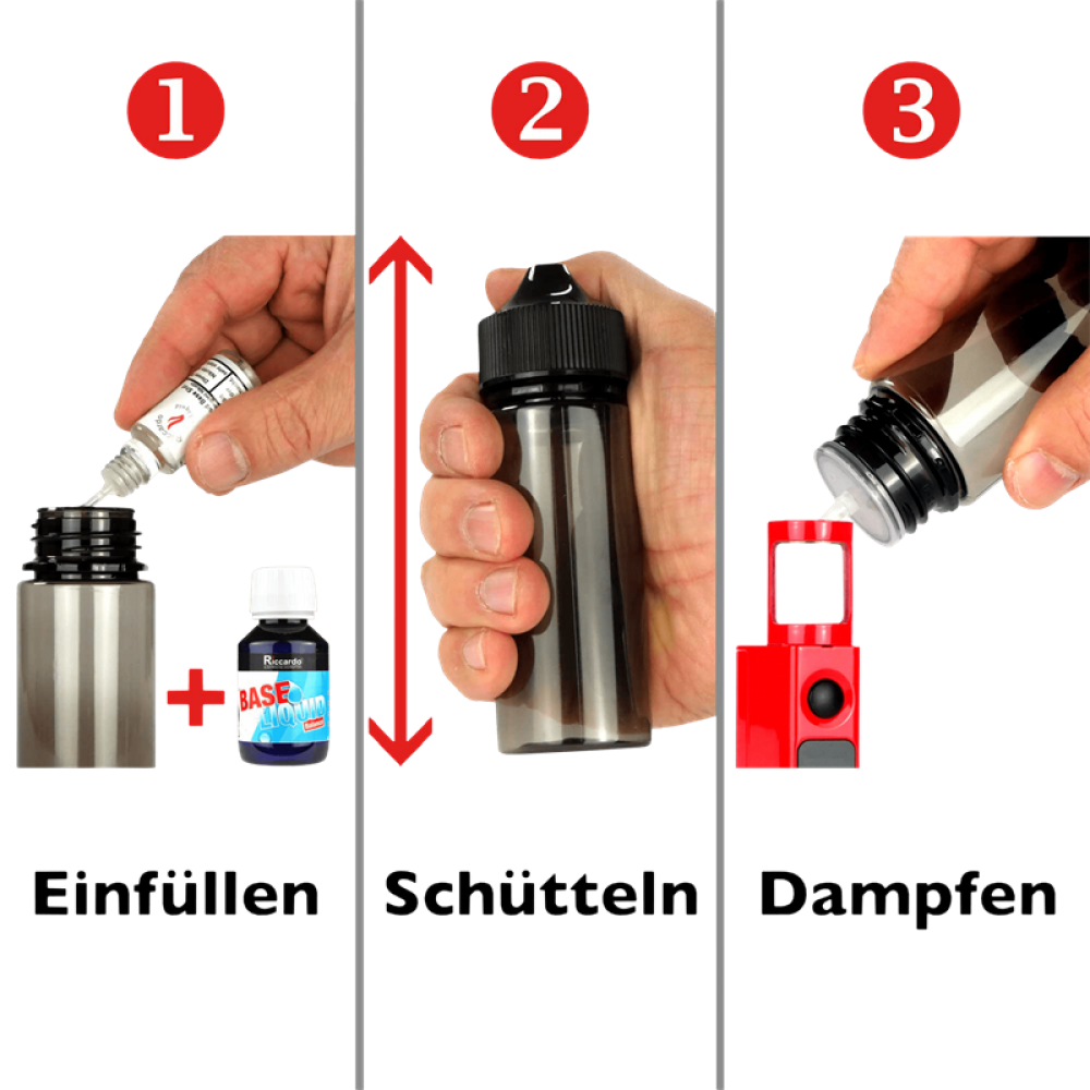 Nach dem Auffüllen schüttelst du die Flasche gut durch, damit sich die einzelnen Bestandteile vermischen. Jetzt steht dem Genuss nichts mehr im Wege. Du kannst direkt losdampfen!