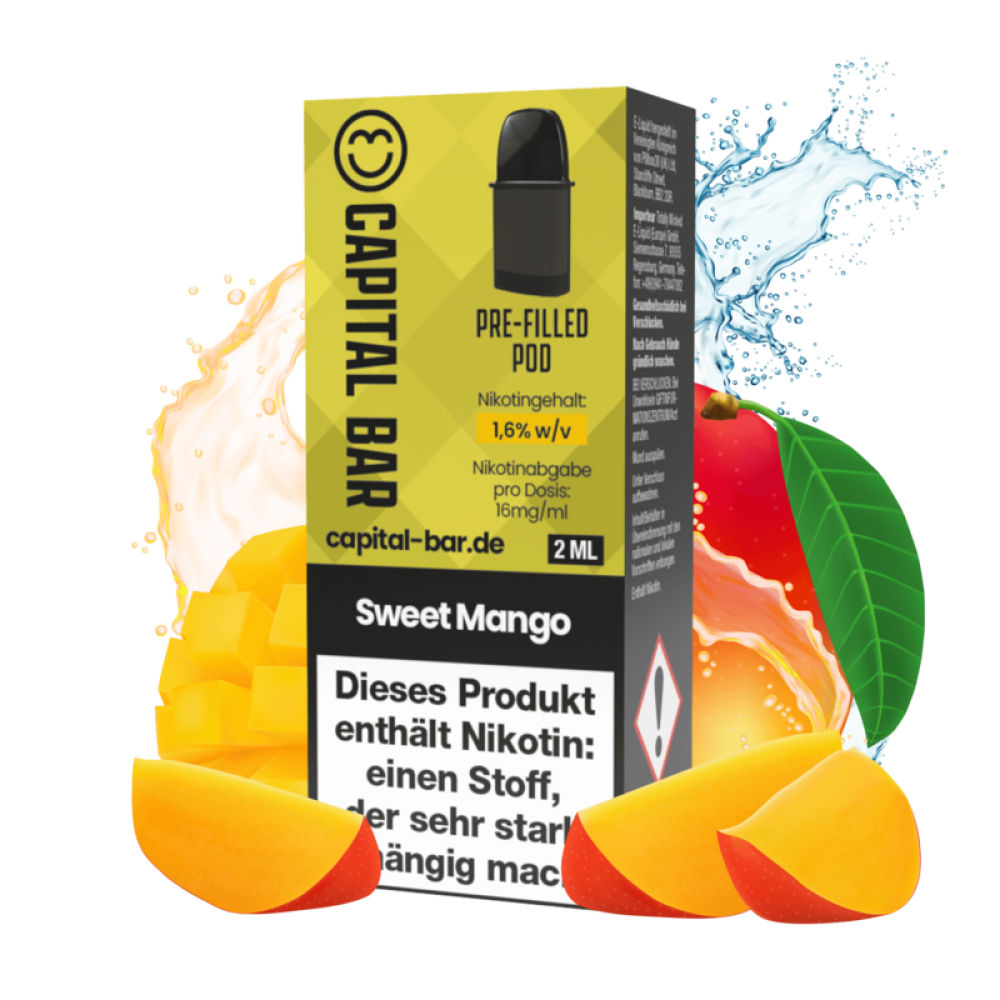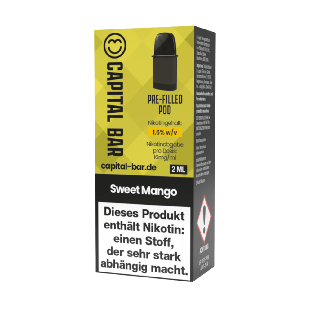 Die Capital BAR Sweet Mango Pod-Kartusche im 1er Pack ist speziell für dein Capital BAR Pod Mod konzipiert. Mit einer Füllmenge von 2 ml E-Liquid und einer Nikotinstärke von 16 mg/ml überzeugt sie durch ein ansprechendes Design sowie exzellenten Geschmack von sonnengereiften Mangos und einer verlockenden Süße. Jede Capital BAR Pod-Kartusche ermöglicht bis zu 600 Züge und verspricht ein erstklassiges Dampferlebnis.