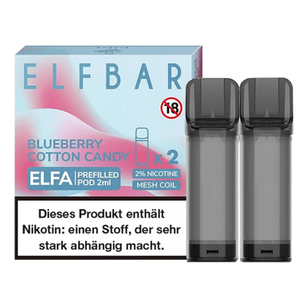 Die 2er Packs ELF Bar ELFA Blueberry Cotton Candy Pods sind vorbefüllte Pod-Kartuschen für dein ELF Bar ELFA Pod Mod. Sie enthalten 2 ml Nikotinsalz Liquid mit einer Nikotinstärke von 20 mg/ml und überzeugen dank der verwendeten Meshed-Technologie mit einem hervorragenden Geschmack von süßer Zuckerwatte und aromatischen Blaubeeren. Jede ELFA Pod-Kartusche kann für bis zu 600 Züge verwendet werden.