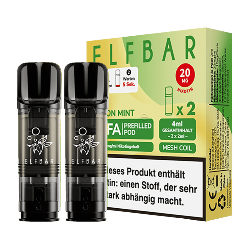 Die 2er Packs ELF Bar ELFA Pods sind vorbefüllte Pod-Kartuschen für dein ELF Bar ELFA Pod Mod. Sie enthalten 2 ml Nikotinsalz Liquid mit einer Nikotinstärke von 20 mg/ml und überzeugen dank der verwendeten Meshed-Technologie mit einem hervorragenden Geschmack von saftigen Zitronen mit erfrischenden Minzblättern. Jede ELFA Pod-Kartusche kann für bis zu 600 Züge verwendet werden.