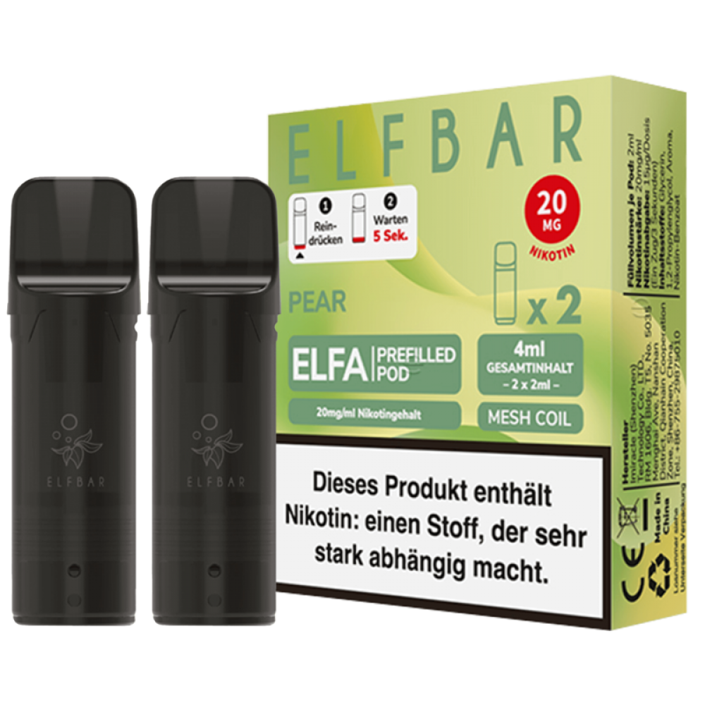 Die 2er Packs ELF Bar ELFA Pods sind vorbefüllte Pod-Kartuschen für dein ELF Bar ELFA Pod Mod. Sie enthalten 2 ml Nikotinsalz Liquid mit einer Nikotinstärke von 20 mg/ml und überzeugen dank der verwendeten Meshed-Technologie mit einem hervorragenden Geschmack von saftiger Birne. Jede ELFA Pod-Kartusche kann für bis zu 600 Züge verwendet werden.