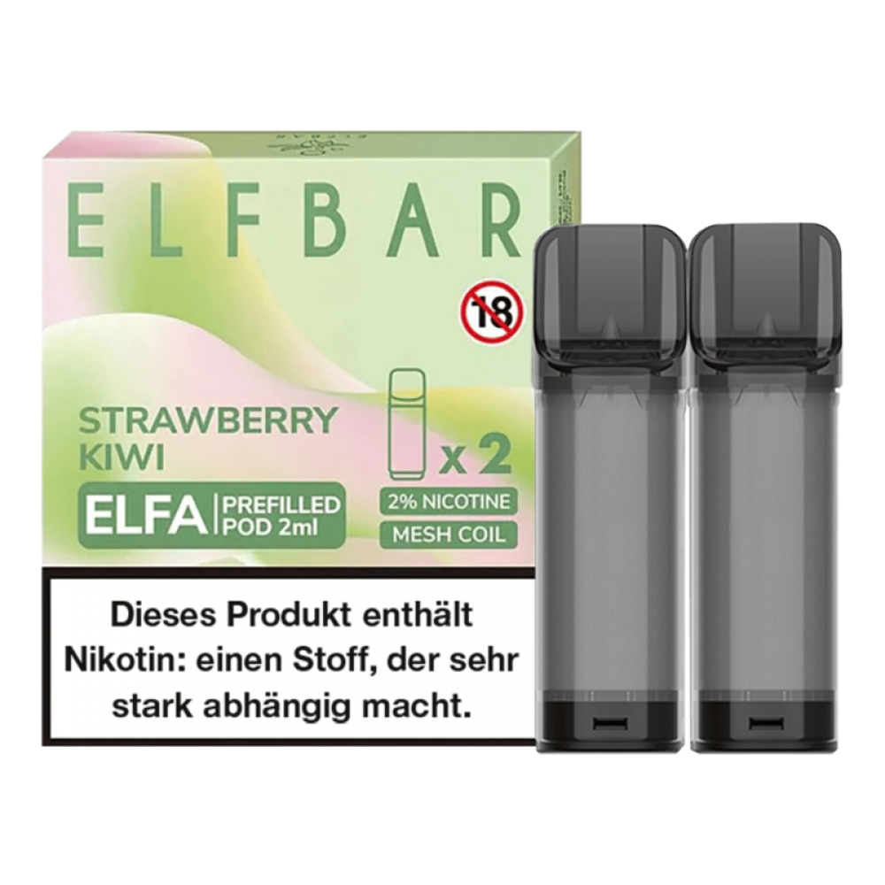 Die 2er Packs ELF Bar ELFA Strawberry Kiwi Pods sind vorbefüllte Pod-Kartuschen für dein ELF Bar ELFA Pod Mod. Sie enthalten 2 ml Nikotinsalz Liquid mit einer Nikotinstärke von 20 mg/ml und überzeugen dank der verwendeten Meshed-Technologie mit einem hervorragenden Geschmack von exotischen Kiwis und sonnenverwöhnten Erdbeeren. Jede ELFA Pod-Kartusche kann für bis zu 600 Züge verwendet werden.