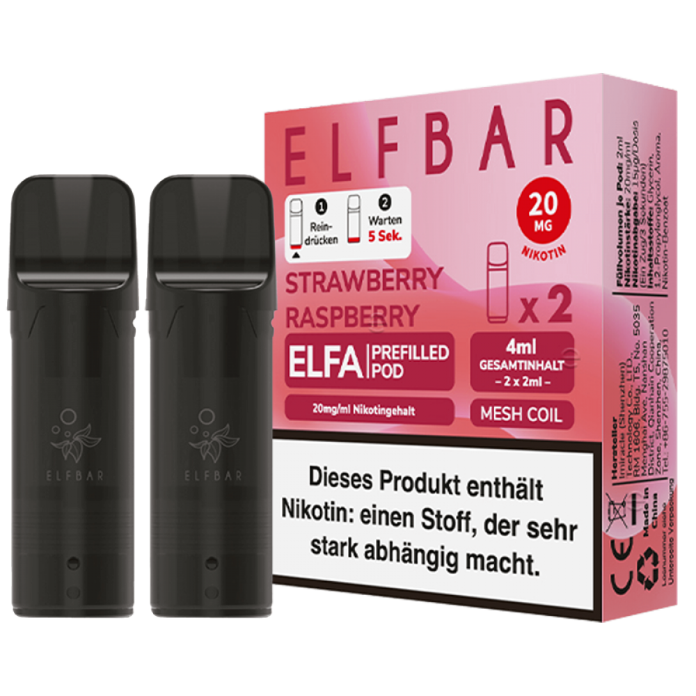 Die 2er Packs ELF Bar ELFA Pods sind vorbefüllte Pod-Kartuschen für dein ELF Bar ELFA Pod Mod. Sie enthalten 2 ml Nikotinsalz Liquid mit einer Nikotinstärke von 20 mg/ml und überzeugen dank der verwendeten Meshed-Technologie mit einem hervorragenden Geschmack von saftigen Erdbeeren und süßen Himbeeren. Jede ELFA Pod-Kartusche kann für bis zu 600 Züge verwendet werden.