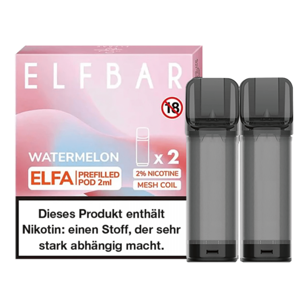Die 2er Packs ELF Bar ELFA Watermelon Pods sind vorbefüllte Pod-Kartuschen für dein ELF Bar ELFA Pod Mod. Sie enthalten 2 ml E-Liquid mit einer Nikotinstärke von wahlweise 0 mg/ml oder 20 mg/ml und überzeugen dank der verwendeten Meshed-Technologie mit einem hervorragenden Geschmack von sommerlicher Wassermelone. Jede ELFA Pod-Kartusche kann für bis zu 600 Züge verwendet werden.
