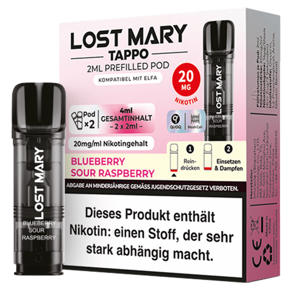 Die Lost Mary Tappo Blueberry Sour Raspberry Pods, erhältlich im praktischen 2er Pack, sind speziell für deinen ELF Bar Lost Mary Tappo Pod Mod entwickelt worden. Diese Pods bieten 2 ml Nikotinsalz Liquid mit einer Nikotinstärke von 20 mg / ml und zeichnen sich durch ihre Verwendung der hochmodernen Meshed-Technologie aus, die einen hervorragenden Geschmack von süßen Blaubeeren und belebend-sauren Himbeeren gewährleistet.