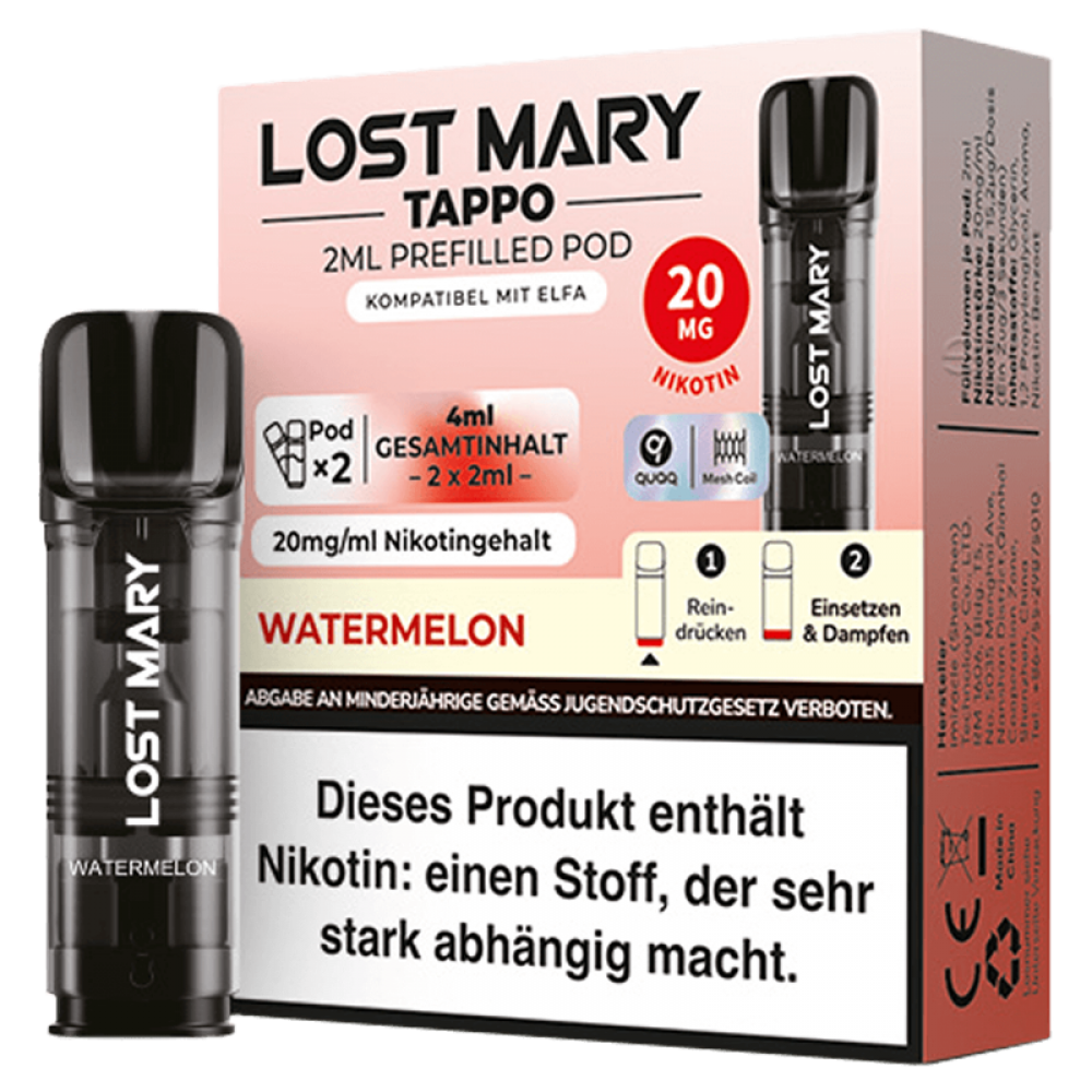 Die Lost Mary Tappo Watermelon Pods, erhältlich im praktischen 2er Pack, sind speziell für deinen ELF Bar Lost Mary Tappo Pod Mod entwickelt worden. Diese Pods bieten 2 ml Nikotinsalz Liquid mit einer Nikotinstärke von 20 mg / ml und zeichnen sich durch ihre Verwendung der hochmodernen Meshed-Technologie aus, die einen hervorragenden Geschmack von leckeren Wassermelonenstückchen gewährleisten.