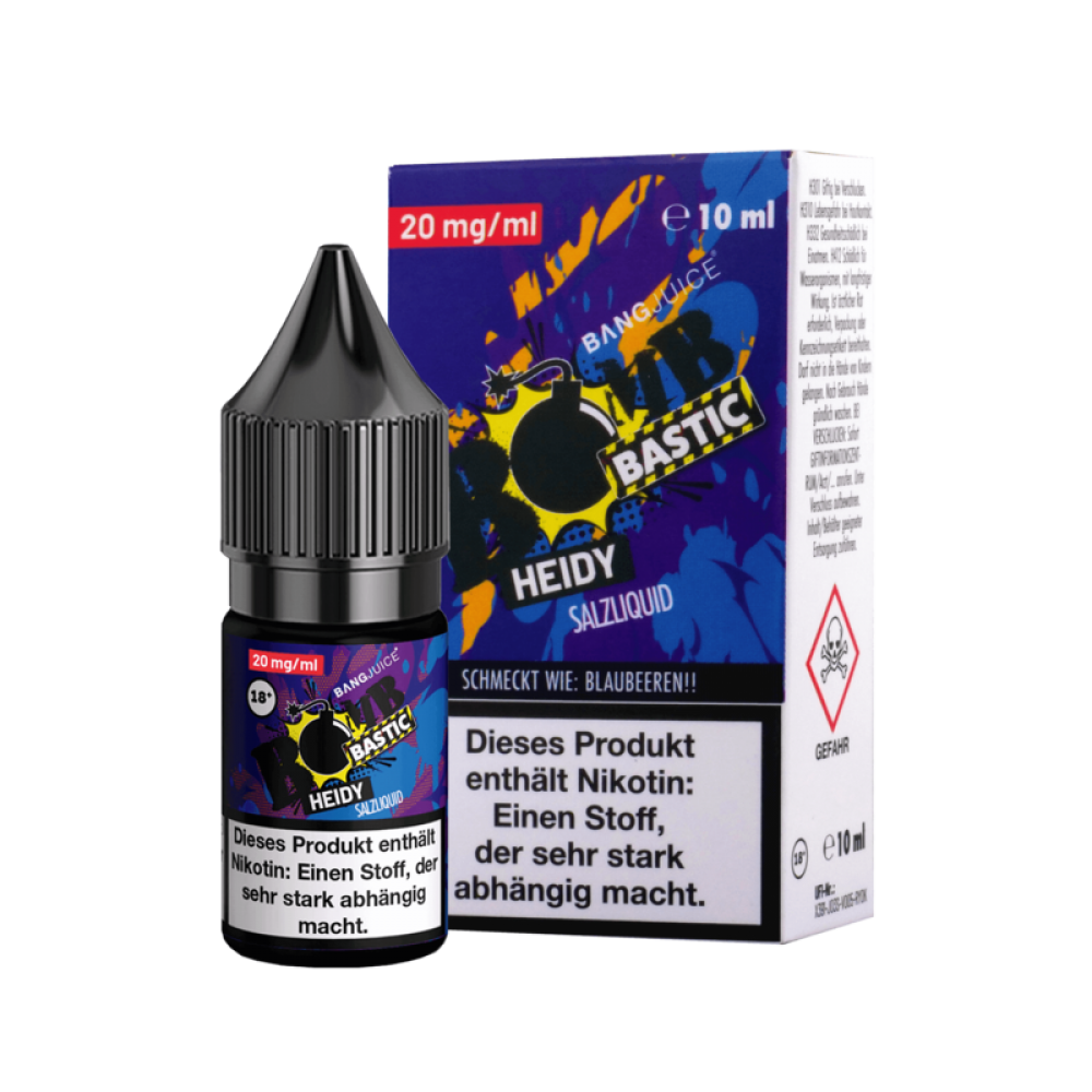 Das Heidy von Bang Juice enthält keine versteckte Almhütte mit einem kleinen Mädchen, sondern bietet stattdessen knackige Heidelbeeren, die von einem benachbarten Hirtenjungen frisch gepflückt wurden. Tauche ein in ein fruchtiges Abenteuer mit einem Hauch von Frische. Die Verwendung von Nikotinsalz garantiert dabei einen sanften Flash und unverfälschten Geschmack.