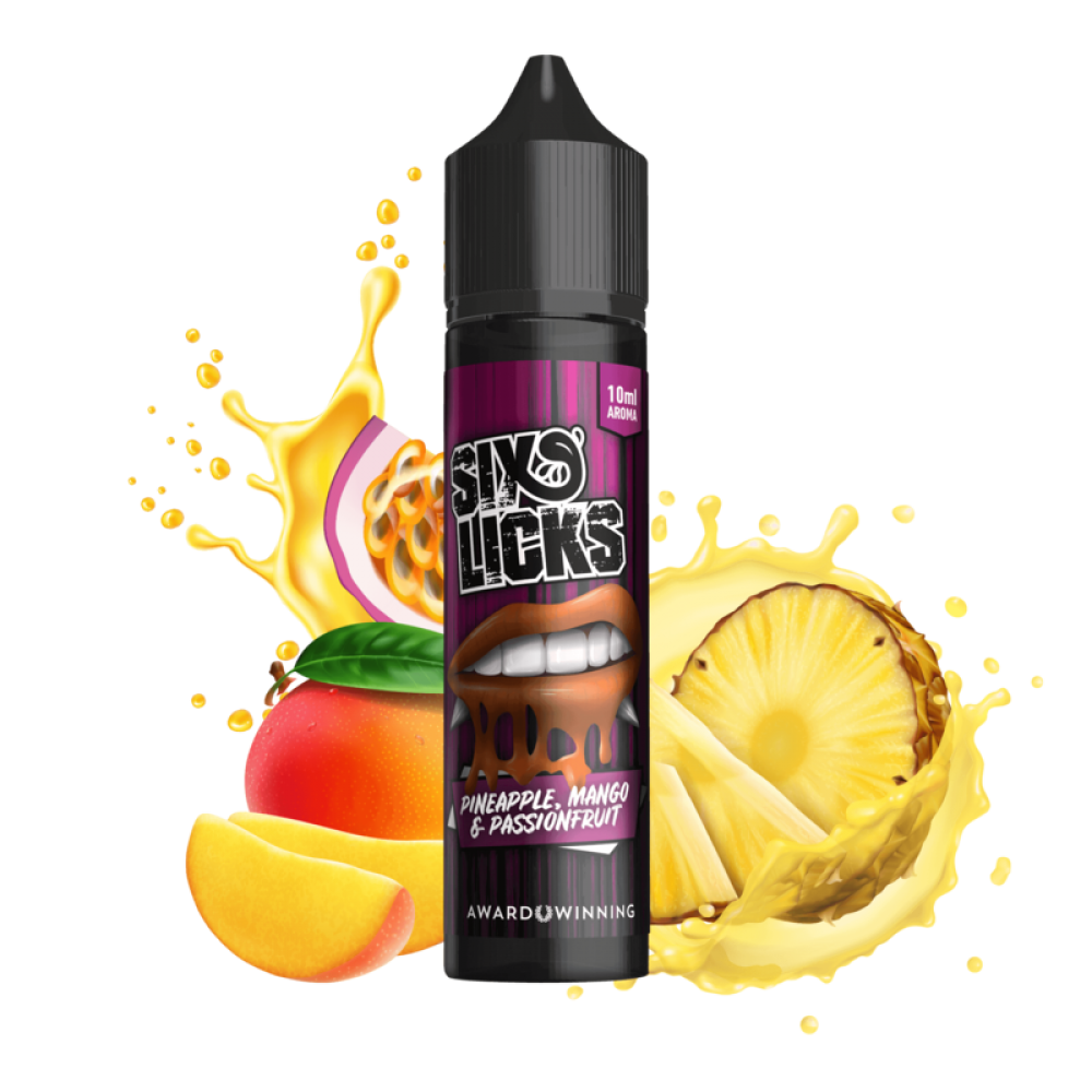 Bist du reif für die Insel? Six Licks katapultiert dich mit seiner neuen Aromakreation direkt in die Karibik. Es erwartet dich ein Früchtebuffet aus fruchtiger Ananas, aromatischer Mango sowie süß-saurer Passionsfrucht.