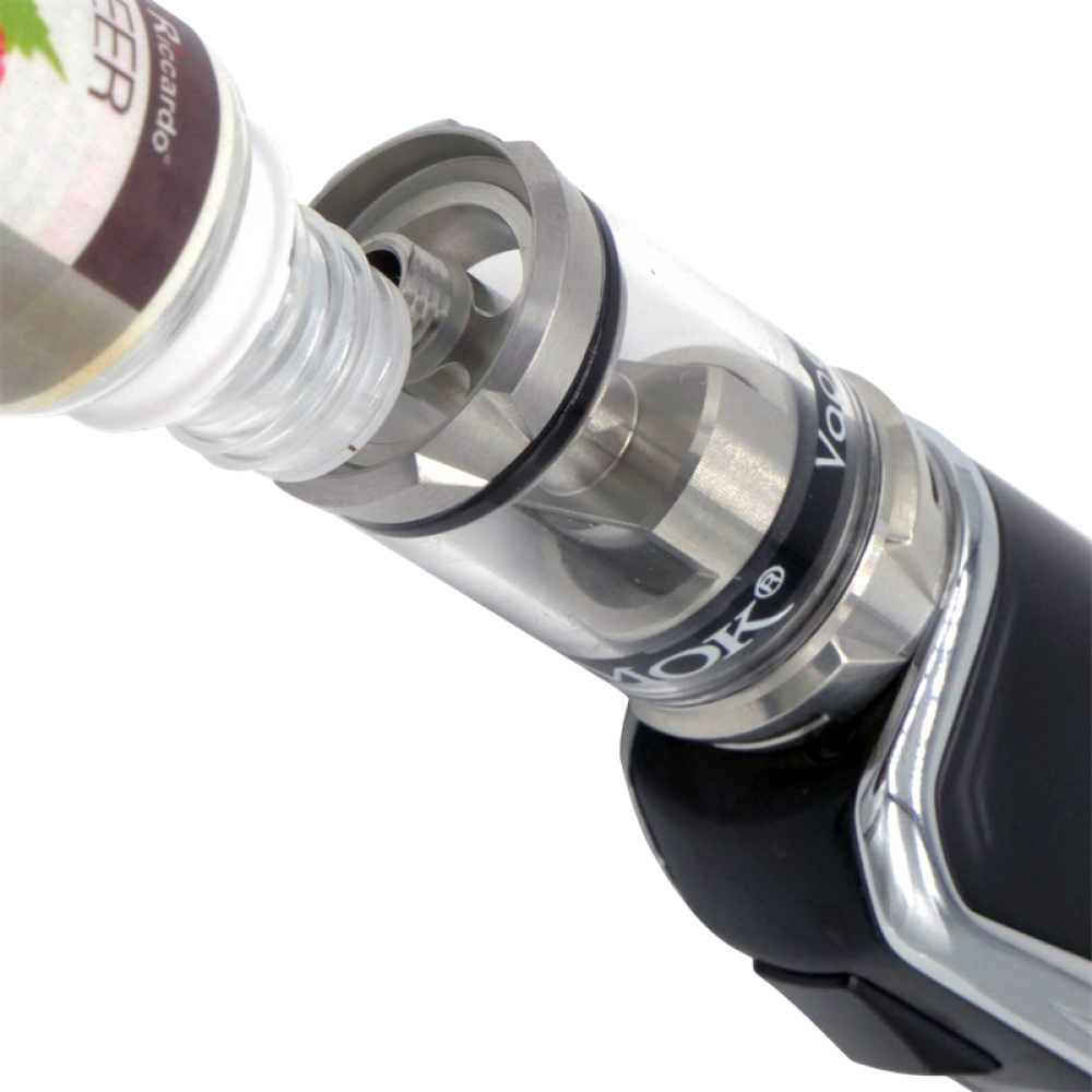 Der Tank umfässt 2,0 ml und wird mit bereits fertigen Meshed-Verdampferköpfen, also feines Drahtgeflecht auf Biowatte, bestückt. Dieses Drahtgitter sorgt für eine große Auflagefläche des Drahtes auf der Watte und somit für umso mehr Geschmack. Das heißt, Sie dürfen sich nicht von der Größe des Gerätes täuschen lassen, denn dieses Kit hat es faustdick hinter den Ohren bzw. dem Mundstück!