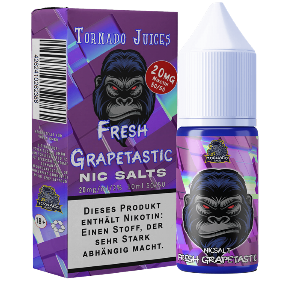Mach dich bereit für einen Geschmackssturm von epischen Ausmaßen mit dem Tornado Juices Nikotinsalz Liquid! Diese exklusive Kreation ist genau das Richtige für anspruchsvolle Dampfer, die nach lebhaften und intensiven Aromen suchen. Genieße den belebenden Genuss von saftigen Trauben, umgeben von einem üppigen Meer aus eisiger Luft.