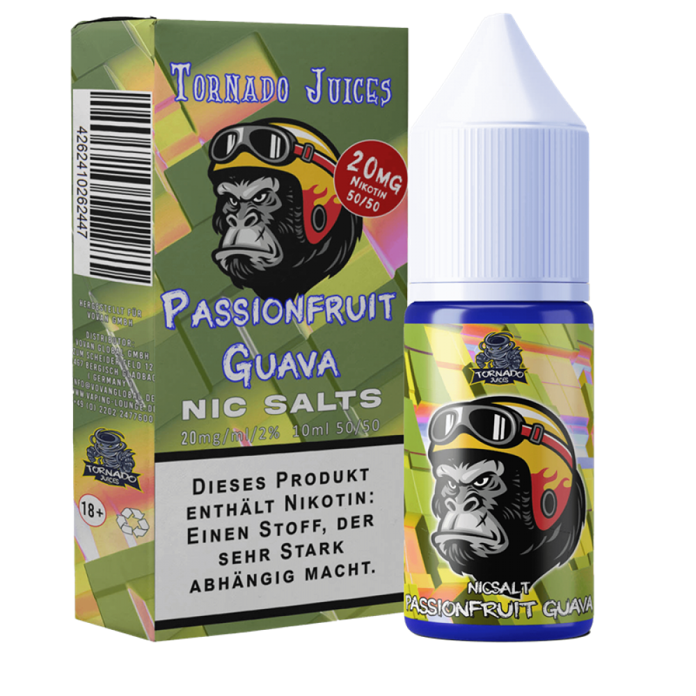 Mach dich bereit für einen Geschmackssturm von epischen Ausmaßen mit dem Tornado Juices Nikotinsalz Liquid! Diese exklusive Kreation ist genau das Richtige für anspruchsvolle Dampfer, die nach lebhaften und intensiven Aromen suchen. Genieße den belebenden Genuss von süßen Maracujas, umgeben von einem üppigen Meer aus säuerlichen Guaven.