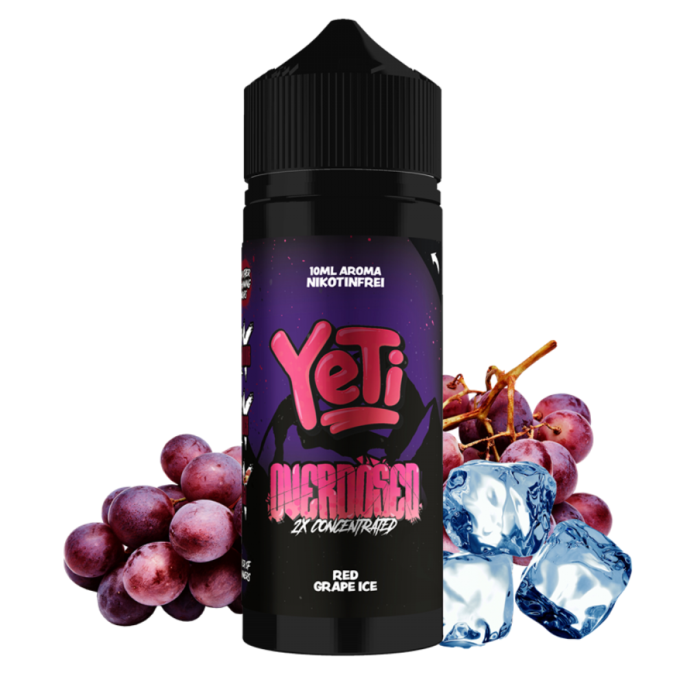 Entdecke die grenzenlose Intensität des Geschmacks! Die Yeti Overdosed Aromen beinhalten eine Menge hochwertiger Tropfen, die der himalayische Yeti für dich bereithält. Genieße eine intensive Explosion aus roten Trauben und eisiger Frische.